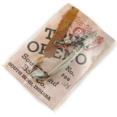 Tento konkrétní kus o délce 4,5 cm (1 3/4") představuje variantu No. 594 klasické nástrahy South Bend Trix-Oreno určenou pro muškařské pruty. Stříbrné kovové tělíčko, uložené v původním pergamenovém obalu s červeným potiskem ze South Bendu v Indianě, nebylo nikdy použito a nabízí pohled na inovace v rybářském náčiní ze 40. let 20. století. Tato nástraha o hmotnosti 2 g (1/16 oz), katalogizovaná pod kódem 17393, je vybavena gumovým přívěskem, který je navržen k přilákání ryb z hlubokých, temných tůní během parných letních dnů. Konstrukce South Bend umožňuje nástraze se při klesání třepotat jako živý hmyz, zatímco jednoduchý pohyb prutu vyvolává potápění a pohyby připomínající plovoucí rybku. Výbava zahrnuje jemný obratlík a háček velikosti 1, zvolené speciálně pro snížení zátěže muškařského prutu v porovnání s běžnými rotačkami. Na zadní straně obalu South Bend uvádí tři různé styly dostupné pro muškařskou velikost a poznamenává, že model 594 byl záměrně dodáván s gumovým přívěskem namísto kovového plíšku.