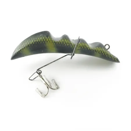 Tělo této nástrahy Bradson s vlnitým profilem pokrývá výrazný vzor štiky s jemnou texturou šupin v podobě včelí plástve. Nástraha o délce 9,5 cm a hmotnosti 12 g se vyznačuje řadou charakteristických hrbů, které definují její unikátní profil. Tmavé svislé pruhy a zelenožluté tóny jsou naneseny na síťovaný potisk šupin, což vytváří realistický vzhled pro různé typy vod. Osazení zahrnuje břišní drátěný systém, který drží jeden trojháček pod tělem, zajištěný středovou kovovou sponou. Tento konkrétní kus Vintage Bradson Wave fish (kód produktu: 23625) je výjimečně zachovalý, s hodnocením stavu 5/5 díky čistému povrchu a nepoškozenému osazení. Očko pro vlasec je umístěno v úplném čele segmentovaného, vroubkovaného těla, což je typické pro kreativní konstrukční řešení amerických nástrah z poloviny minulého století.