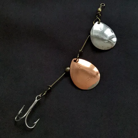 Niklový a měděný list vytvářejí hlavní vizuální kontrast u tohoto 7g (1/4 oz) exempláře. Dvojrotačka Vintage Luxon 2 se vyznačuje dvěma odlišnými kovovými povrchovými úpravami s vyraženým číslem 2 a používá listy ve tvaru kapky uspořádané v tandemu na pevném drátěném rámu mosazné barvy. Tato americká rarita o délce 10 cm (4") prezentuje funkční design, kterým byla značka LUXON známá, s důrazem na odolnost drátěné konstrukce. Sestavu doplňují mosazné korálky a přesně ohnutá očka, která zajišťují komponenty bez zbytečného navýšení hmotnosti. Nástraha s produktovým kódem 22217 je ve vynikajícím stavu, přičemž kovové povrchy si zachovávají svůj původní lesk, což odpovídá hodnocení stavu 5/5. Trojháček je připevněn pomocí standardního očka, díky čemuž zůstává původní kování ve stříbrném tónu ústředním prvkem celé konstrukce.