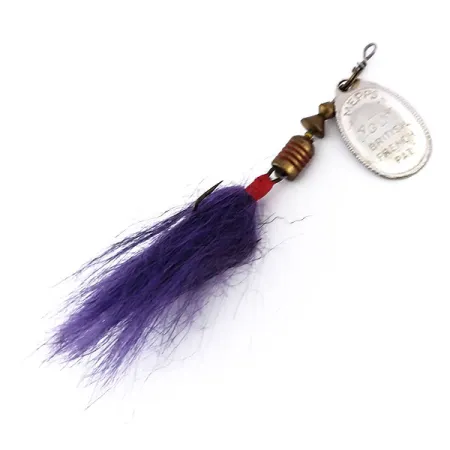 Fialový bucktailový střapec odlišuje tento exemplář ze 70. let a poskytuje ostrý vizuální kontrast ke stříbrnému rotačnímu listu. Tato nástraha o hmotnosti 4,7 g (3/16 oz) se vyznačuje klasickou konfigurací Mepps Aglia s listem velikosti 2, který má na lícní straně vyraženo „BRITISH FRENCH PAT.“ a na rubu „MADE IN FRANCE“. Tyto součásti představují éru, kdy se díly vyráběly ve Francii a sestavovaly v USA pod vedením Todda Sheldona. Celková délka činí 5,5 cm (2 1/4") a konstrukce zahrnuje osu z pevného drátu, dva mosazné korálky těla a jasně červený distanční korálek umístěný těsně nad trojháčkem se střapcem. Stříbrné pokovení listu zůstává jasné, což přispívá k hodnocení stavu 5/5. Vázání střapce je bezpečné a zachovává si původní plnost z výroby. Specializovaný strmínek umožňuje listu rotovat kolem mosazného těla, což je základní konstrukční prvek vynálezu Andrého Meulnarta z roku 1938. Tento konkrétní kus, označený produktovým kódem 10130, slouží jako zachovalý příklad nejuznávanějšího profilu rotačky na světě.