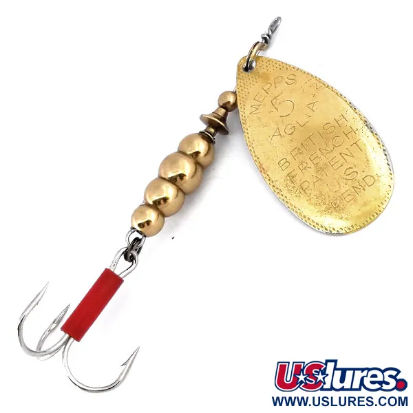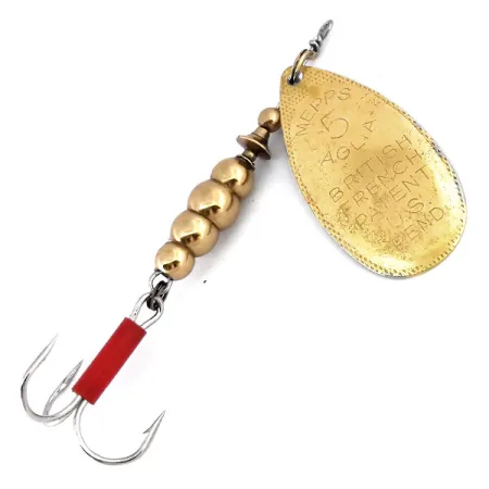 S ražením „MADE IN FRANCE“ na zadní straně listu velikosti 5 tato nástraha zdůrazňuje evropské kořeny legendárního designu. Tento mosazný exemplář váží 1/2 oz (14 g) a měří 3 1/4" (8 cm), čímž představuje klasickou éru Mepps Aglia ze 70. let. Přední strana listu je hluboce gravírována nápisem „MEPPS AGLIA 5“ spolu s informacemi o britských a francouzských patentech a upozorněním na čekající patent v USA, což odkazuje na globální expanzi značky v polovině století. Na raménku trojháčku je nasazena jasně červená plastová bužírka, která slouží jako výrazný bod útoku proti lesklému tělu ve zlatém tónu. Samotné tělo se skládá ze čtyř odstupňovaných mosazných korálků, které poskytují potřebnou hmotnost pro nahazování a stabilitu. Tento list ve tvaru kapky je navržen pro kuželový rotační systém, který mu umožňuje volně se otáčet kolem drátěné osy. Tato nástraha s produktovým kódem 10601 je ve velmi zachovalém stavu, s hodnocením 4/5 za čistotu prvků a čitelnost ražby. Reprezentuje historické období, kdy se kvalitní komponenty vyrobené ve Francii sestavovaly pro severoamerický trh.