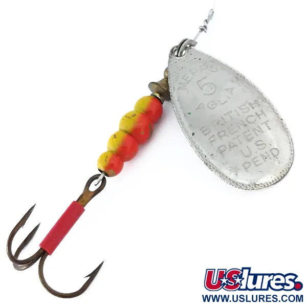 Stříbrná povrchová úprava na naddimenzovaném rotačním listu ve tvaru kapky charakterizuje tento Vintage Mepps Aglia 5 (1970s), identifikovaný pod produktovým kódem 11019. Tento exemplář o hmotnosti 1/2 oz (14 g) a délce 3 1/4" (8,3 cm) je vybaven klasickým raženým listem s nápisem „MEPPS AGLIA 5“ a informacemi o patentech včetně britských, francouzských a čekajících amerických známek. Na zadní straně listu je jasně vyznačeno „Made in France“, což odráží původ nástrahy jako sestavy francouzských komponentů pro americký trh. Tělo se skládá ze čtyř segmentovaných korálků lakovaných v jasně žluto-červeném vzoru, zakončených trojháčkem v bronzové úpravě chráněným zářivě červenou plastovou bužírkou. Tato rotační třpytka je hodnocena stavem 5/5, což vykazuje výjimečné zachování kovových povrchů a kování. Pověst modelu Aglia je založena na systému rotace kolem kuželu, který reaguje na proud vody, což je design poprvé vyvinutý Andre Meulnartem v roce 1938. Každá část této nástrahy z éry 70. let, od mosazného třmenu až po drátěnou osu, zůstává pevná a historicky věrná.