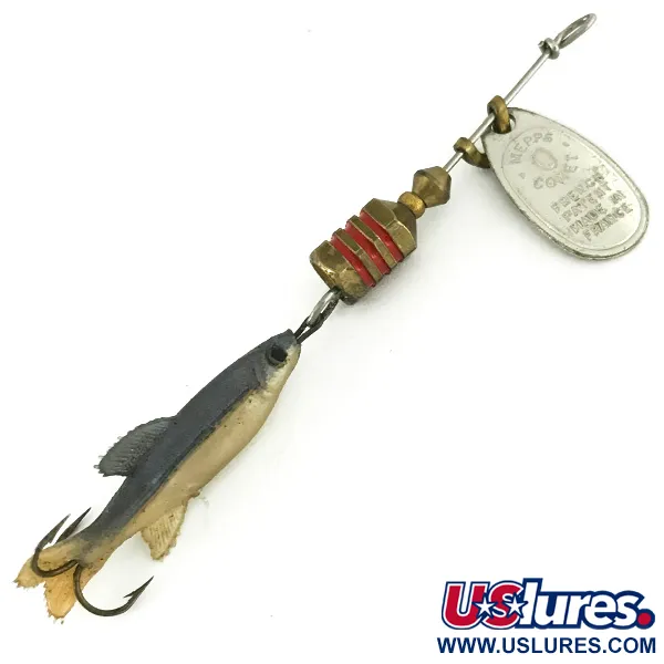 Ražený stříbrný list s výrazným označením „Mepps Comet“ a „French Patent“ charakterizuje tento exemplář ze 70. let 20. století. Nástraha váží 3,5 g (1/8 oz), měří celkem 7 cm (2 3/4") a kombinuje tradiční konstrukci rotační třpytky s realistickou gumovou rybkou. Zatížené mosazné tělíčko je zdobeno čtyřmi výraznými červenými kroužky, které vytvářejí vysoce viditelný kontrast ke stříbrným prvkům. Samotná rybka má tmavě šedý hřbet a světle krémové břicho, což napodobuje profil malé nástražní rybky. Nástraha je postavena na pevném drátěném karkasu a veškeré komponenty jsou ve vynikajícím stavu 5/5, a to včetně ostrého trojháčku v ocasní části. Tento model 7206 vykazuje ostré ražení na listu, které je typické pro ranou francouzskou výrobu z doby, kdy značka Mepps expandovala na trh v USA. Stříbření si zachovává svůj původní lesk a nevykazuje žádné známky opotřebení kovových povrchů. Drobné detaily, jako je mosazný třmen a přesně vsazené oko gumové rybky, svědčí o vysokých výrobních standardech těchto hybridních nástrah.
