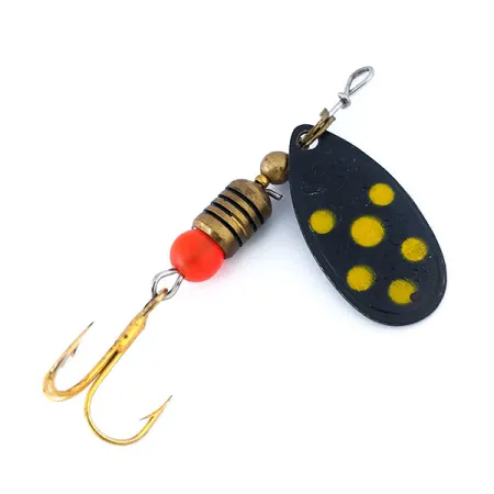 Pět vysoce kontrastních žlutých teček je pečlivě namalováno na černém povrchu oválného listu, což určuje tuto Mepps Comet 2 jako klasiku z konce 60. let. Tato rotační třpytka o hmotnosti 1/8 oz (4 g) měří na délku 5 cm (2") a využívá součástky vyrobené ve Francii, které byly sestaveny v USA. Jasně oranžovo-červený korálek je umístěn u základny mosazného žebrovaného těla, těsně nad pozlaceným trojháčkem, a slouží jako spouštěč záběru. Nástraha s produktovým kódem 10734 je ve stavu 5/5 s jasným lakem a čistým povrchem všech kovových prvků. Zadní strana listu je celočerná, což kontrastuje s teplými tóny mosazných podložek a korálků, které tvoří zátěžové jádro třpytky.