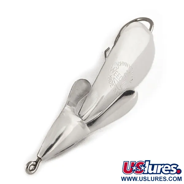 Niklování dodává této 6cm (2 1/4") historické plandavce zářivý lesk. Na těle je jasně vyražen název Johnnie O’Neil Weed Wing a původ USA. Tato nástraha o hmotnosti 12 g (2/5 oz) s kódem 12154 má charakteristický křídlovitý tvar, který Johnnie O’Neil poprvé představil v Akronu v Ohiu v roce 1957. Integrovaný jednoháček je opatřen drátěným chráničem pro lov v hustých porostech, kde by se běžné nástrahy zachytily. Stav je hodnocen jako 5/5, přičemž kovový povrch zůstává pozoruhodně čistý a bez výrazného opotřebení. Tento model pochází z doby před prodejem společnosti Harrison Industries v polovině 60. let, jde tedy o pravý originál z Ohia z období těsně po získání patentu v roce 1962.