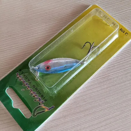 Tato nástraha o hmotnosti 7 g (1/4 oz) zaujme výrazným modro-stříbrným přechodem s karmínovým detailem kolem oka. S délkou 4,5 cm (1 3/4") představuje model Wahoo Key Largo Swim'n Fin (kód produktu 16498) spojení ruční práce z Dominikánské republiky a komponentů vyrobených v USA. Tento konkrétní chrastící model je uložen v originálním zeleno-zlatém balení „Premier Fishing Tackle“ a jedná se o dosud nepoužitý exemplář. Průsvitné tělo odhaluje vnitřní reflexní fólii imitující šupiny, kterou doplňuje ostrý trojháček a robustní očko v přední části. Nástraha pochází od společnosti Wahoo Fishing Products z North Fort Myers na Floridě a vyznačuje se pro výrobce typickou odolnou povrchovou úpravou a kvalitním hardwarem pro spolehlivé záseky. Detail červeného oka vytváří vysoce kontrastní bod na jinak štíhlém, hydrodynamickém profilu těla.
