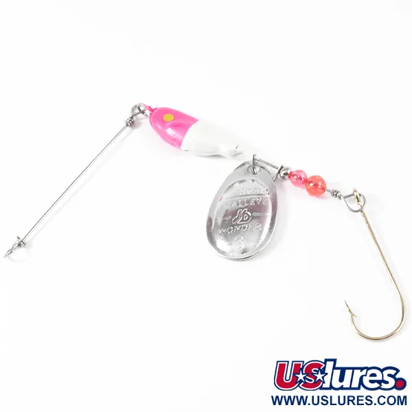 Na niklovaném listu je jasně vyražen identifikátor této nástrahy Walleye Wonder 3, kód produktu 3572, vyrobené společností South Bend. Nástraha váží 17 g (3/5 oz) a vyznačuje se výraznou dvoubarevnou hlavou s jasně růžovou přední částí přecházející do bílé zadní části, doplněnou malou žlutou oční tečkou. Konstrukce odpovídá klasickému designu spinnerbaitu typu „zavírací špendlík“ s původem v USA. Mezi listem velikosti 3 a jedním velkým háčkem je drátěný rám osazen dvěma broušenými oranžovo-růžovými korálky a malými niklovými distančními podložkami. Tento exemplář je ve vynikajícím stavu s hodnocením 5/5, vykazuje čistý lak a lesklé kovové součásti. Hluboce vyražené logo na listu zůstává ostré a čitelné, což odráží kvalitu výroby historického rybářského vybavení South Bend.