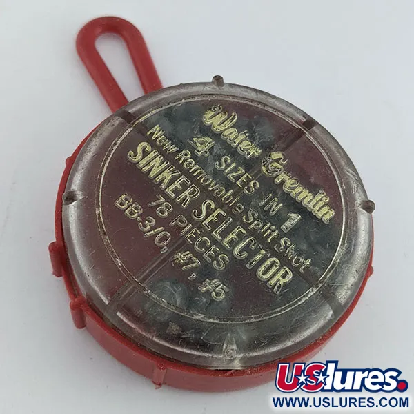 Zářivě červený kulatý dávkovač s originálním poutkem na zavěšení slouží jako pouzdro pro tento vintage selektor zátěží Water Gremlin. Tato kolekce 78 kusů, označená produktovým kódem 22198, nabízí různé velikosti včetně BB, 3/0, #7 a #5. Průhledné akrylové víčko je zdobeno zlatým písmem s detaily o obsahu, přičemž každá velikost je uspořádána ve vlastním výsečovém oddílu. Na zadní straně je do červeného plastu vylisováno logo Water Gremlin Co. z White Bear, Minn. 55110, spolu s návodem k použití těchto vyjímatelných bročků pouze prsty bez použití nářadí. Na zadní straně zůstal nalepený zachovalý štítek s čárovým kódem a číslem #700. Tato položka nebyla dříve použita a vykazuje čisté linie a jasný text, jaký se očekává u dobře skladovaného kusu historie rybářské bižuterie vyrobené v USA. Vnitřní olověné bročky si zachovávají svou původní tmavě šedou povrchovou úpravu, která je viditelná přes dělené otočné víčko.