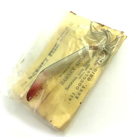 Bílý nátěr přecházející do zářivě červené špičky pokrývá zužující se kovové tělo této 7g (1/4oz) nástrahy. Plandavka Weedless Barney Spoon, vyrobená společností Gougler Line Mfg. Co. v Kentu v Ohiu, byla navržena speciálně pro lov v husté vegetaci. Tento 5,5cm (2 1/4") exemplář je osazen jednoháčkem chráněným kovovou ochranou proti vázkám a doplněn bílým vícevláknovým gumovým střapcem. Její konstrukce umožňuje univerzální použití pro nahazování, trolling i jigging, a byla dokonce využívána při vertikálním lovu na dírkách. Tato nástraha s kódem 5739 je nepoužitá a uchovaná v původním průhledném obalu.