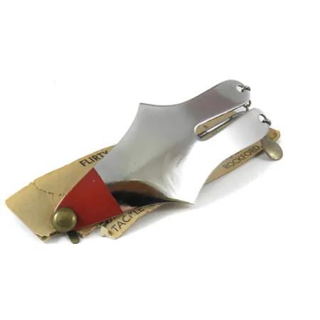 Plandavka Weedless Flirty Gertie o délce 3 1/4" (8,3 cm) se vyznačuje výrazným niklovaným tělem s nápadnou červenou přední částí. Tato robustní kovová nástraha o hmotnosti 3/4 oz (21 g) byla navržena v Rockfordu ve státě Illinois speciálně pro lov v hustých porostech. Jediný velký háček je integrován do nezadrhávající sestavy (weedless), umístěné mezi rozšířenými křídly leštěného těla. Dvojice malých kovových lístků ve tvaru kapky je k zadní části připevněna pomocí kroužků a dodává nástraze jemné vizuální podněty při přitahování. Tento konkrétní exemplář s kódem produktu 2961 je v nepoužitém stavu (hodnocení 6). Zůstává připevněn k původní kartě s adresou výrobce 1916-20th Ave. Spodní strana odhaluje čistý, lomeně bílý lak, který kontrastuje s reflexním niklovým vrškem.