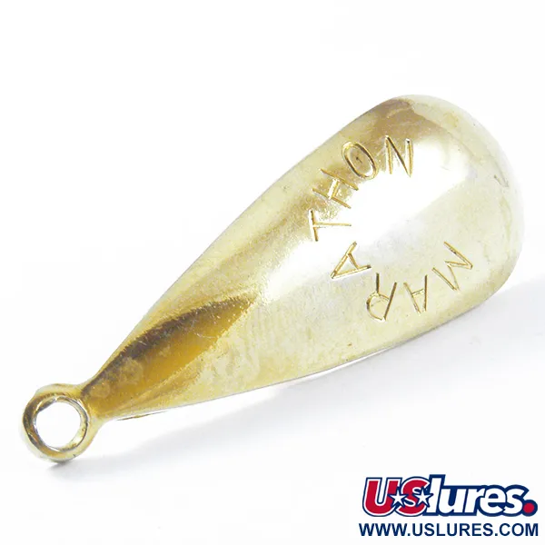 Na 7g (1/4oz) těle ve tvaru kapky je jasně vyražen název „MARATHON“, podpis společnosti Marathon Bait Company z Wisconsinu, která působila v letech 1929 až 1979. Tento Weedless Marathon, identifikovaný produktovým kódem 3375, se vyznačuje leštěným zlatým povrchem na svém 4,5cm (1 3/4") těle. Pro pohyb v husté vegetaci bez váznutí konstrukce obsahuje jednoháček chráněný drátěnou ochranou s malým růžovým korálkem. Tento konkrétní exemplář je v pozoruhodném stavu, zachovává si svůj původní lesk bez známek opotřebení, což odpovídá hodnocení stavu 5/5. Konstrukce se vyznačuje pevným integrovaným očkem na užším konci, což je typické pro odolné náčiní vyráběné společností Marathon během její padesátileté historie na americkém Středozápadě.