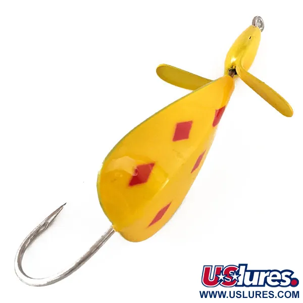 Vzor „Five of Diamonds“ – klasický žlutý základ se čtyřmi výraznými červenými kosočtverci na listu a jedním na hlavě – je typický pro tento Weedless Panther Martin Weed Wing. Tato nástraha, navržená pro lov v husté vegetaci, je vybavena velkým jednoháčkem umístěným za tělem ve tvaru kapky. Žlutě lakovaná kovová vrtulka na špičce je určena k vytváření rozruchu na hladině, aniž by zachytávala nečistoty. Tento konkrétní kus s produktovým kódem 11398 váží 1/2 oz (14 g) a měří 2 3/4" (7 cm) na délku. Spodní strana nástrahy odhaluje čistý, nelakovaný stříbrný kovový povrch, který kontrastuje s jasným lakem na horní straně. Vyrobeno v USA, tento exemplář je nepoužitý a ve vynikajícím stavu.