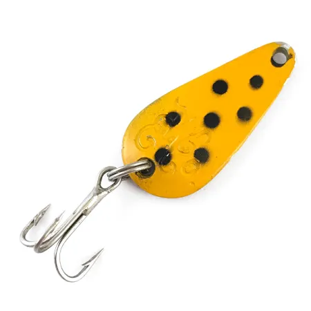 Tato plandavka Weller se zářivě žlutým povrchem zdobeným šesti černými tečkami je dokonalým příkladem amerického řemesla z poloviny 20. století. Zadní strana má leštěný niklový povrch, který vytváří výrazný kontrast k malované přední části. S hmotností 3,7 g (1/8 oz) a délkou 3 cm (1 1/4") je tato nástraha s malým profilem všestranným nástrojem pro lov pstruhů nebo okounů na lehkou přívlač. Tento konkrétní kus s produktovým kódem 4873 má hodnocení stavu 5/5, přičemž původní lak i osazení zůstaly ve vynikajícím stavu. Výbava zahrnuje ostrý trojháček připevněný standardním kroužkem v zadní části, zatímco přední očko zůstává volné pro přímý uzel nebo karabinku. Tato nástraha Weller, vyrobená v USA, odráží jednoduchý a účinný design, který sběratelé oceňují pro jeho historický význam ve vývoji amerických kovových nástrah. Jemné reliéfní detaily na lakovaném povrchu dodávají texturu charakteristickou pro tyto klasické lisované kovové plandavky.