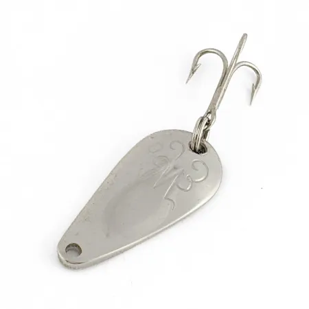 Poniklovaný povrch poskytuje čistý a jasný lesk na raženém těle této americké klasiky, která demonstruje historické řemeslné zpracování společnosti Weller. S délkou pouhých 2,6 cm a hmotností 3,5 g představuje Weller Gypsy King Deluxe (kód produktu 23042) vzácný lehký úlovek pro specializované sbírky historických nástrah. Přední strana plandavky je zdobena složitým gravírovaným vzorem s elegantními ornamenty kolem středového stylizovaného emblému, což je charakteristický prvek řady Deluxe. Zadní strana je hladce vyleštěna do vysokého niklového lesku. Nástraha je ve stavu 5/5 a nebyla nikdy použita, přičemž si zachovává svou původní celistvost od očka pro vlasec až po stříbrný trojháček. Osazení je upevněno robustním kroužkem, což odpovídá poctivé konstrukci typické pro americkou produkci poloviny minulého století.