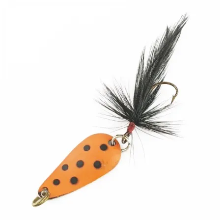 Oranžový smalt s výraznými černými puntíky pokrývá list ve tvaru kapky u modelu Weller Gypsy King Deluxe, což je klasická mikro-plandavka původem z USA. S jemnou hmotností 1/16 oz (1,7 g) je tato nástraha určena pro příznivce ultralehké přívlače zaměřené na pstruhy nebo okouny. Tělo o délce 2,7 cm doplňuje výrazný střapec z černého peří, který je k raménku háčku přivázán červenou nití, což nástraze dodává na objemu. Tento exemplář, vedený pod kódem 24165, je ve vynikajícím stavu 5/5, s velmi zachovalým kováním a čistou povrchovou úpravou listu i pevného jednoháčku. Přístup značky Weller k sérii Gypsy King často kombinoval kovové povrchy s jasnými barvami, což je patrné na kontrastu oranžového povrchu s tmavým péřovým střapcem.