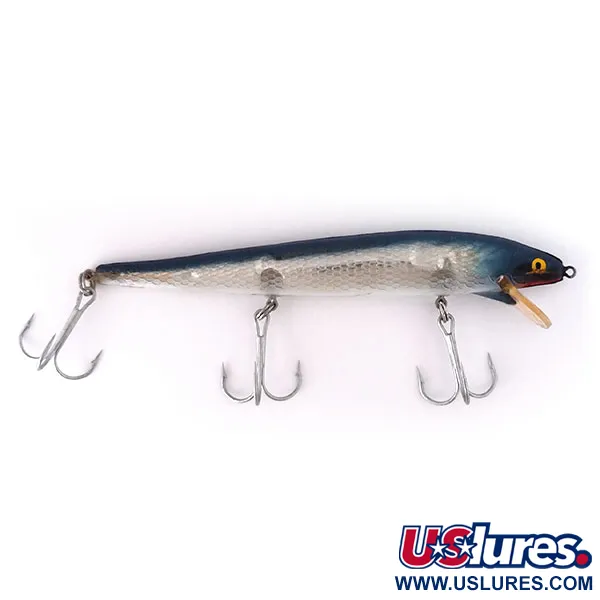 Stříbrné a modré tóny definují šupinatý povrch tohoto 14 cm (5 1/2") dlouhého wobleru typu minnow. Tento exemplář od Whopper Stopper pochází z USA a nese produktový kód 10564. S váhou 14 g (1/2 oz) se HELLCAT vyznačuje štíhlým, protáhlým profilem a je vybaven třemi robustními trojháčky. Nořítko z čirého plastu nese vyražený název modelu a nachází se pod výraznýma žlutýma očima, které tvoří ostrý kontrast k tmavě modré hlavě. Povrchová úprava je dobře zachovalá s drobnými povrchovými značkami, což odpovídá hodnocení stavu 4/5. Sběratelé ocení neporušený hardware a klasický profil používaný k lovu štik, maskalungů nebo mořčáků při přívlači i trollingu.