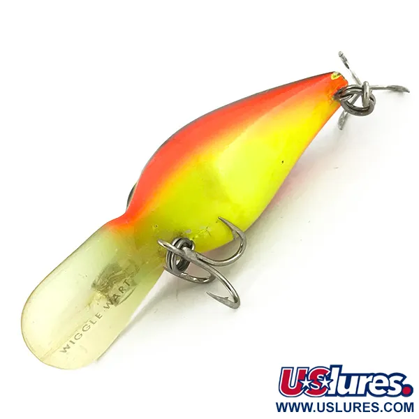 Výrazné barevné schéma AV68 definuje tento UV-reaktivní model, který se vyznačuje přechodem z hluboce zeleného hřbetu do modré, přes sytě červený střed až po neonově žluté břicho. Tento Storm Wiggle Wart UV (kód produktu 7328) váží 12 g (2/5 oz) a měří 5 cm (2"). Jedná se o specializovaný hlubokopotápivý wobler navržený pro dosažení hloubek mezi 2 m až 5,5 m (6,5 ft - 18 ft) při nahazování nebo trollingu. Stav je solidních 5/5, povrchová úprava zůstává zářivá a osazení, včetně dvou stříbrných trojháčků, nevykazuje žádné známky opotřebení. Originální značení „Wiggle Wart“ je zřetelně vylisováno na spodní straně čiré potápivé lopatky. Vnitřní chrastítka zajišťují hlučný profil určený k lovu lososů, okounů, candátů a štik. Velké žlutě lemované oči s černými zornicemi slouží jako klasický vizuální znak této v USA vyráběné série.