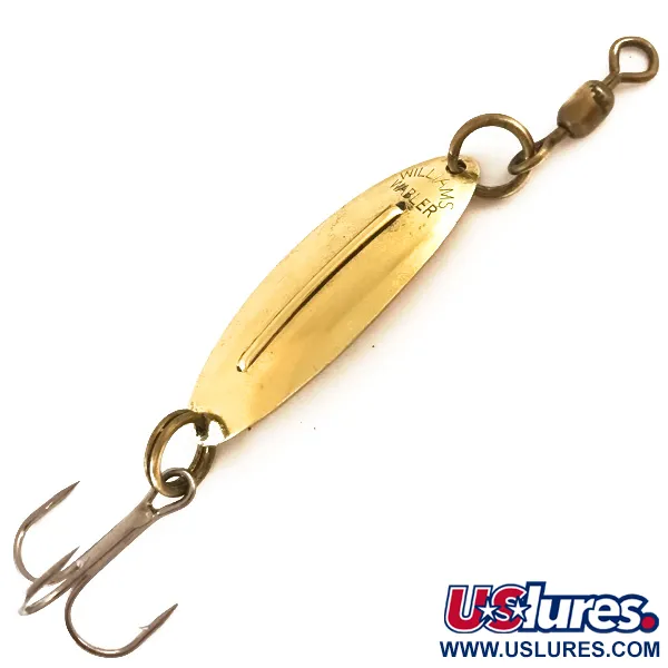 Tato kompaktní plandavka zářící leštěným zlatým povrchem je vybavena charakteristickým vyvýšeným stabilizačním hřbetem, díky kterému je značka Williams po desetiletí základem každé rybářské výbavy. Tento konkrétní exemplář je Williams Wabler W20, identifikovaný pod produktovým kódem 4734, a představuje nejuznávanější design v historii kanadské výroby společnosti. Měří 3 cm (1 1/4") a váží jemných 2,5 g (3/32 oz), což z ní činí specialistu na lehkou přívlač vhodnou pro různé rychlosti vedení. Na horní konvexní straně je jasně viditelná ražba „WILLIAMS WABLER“, doplněná robustním hardwarem včetně horního obratlíku a ostrého trojháčku. Původně určená pro lov štik a candátů, tato nástraha zůstává ve stavu 5/5 a vykazuje vysoce kvalitní pokovení drahými kovy, kterým je značka proslulá. Strukturální žebro probíhající středem je klíčovým technickým prvkem zajišťujícím hydrodynamickou stabilitu, která definuje řadu Wabler.