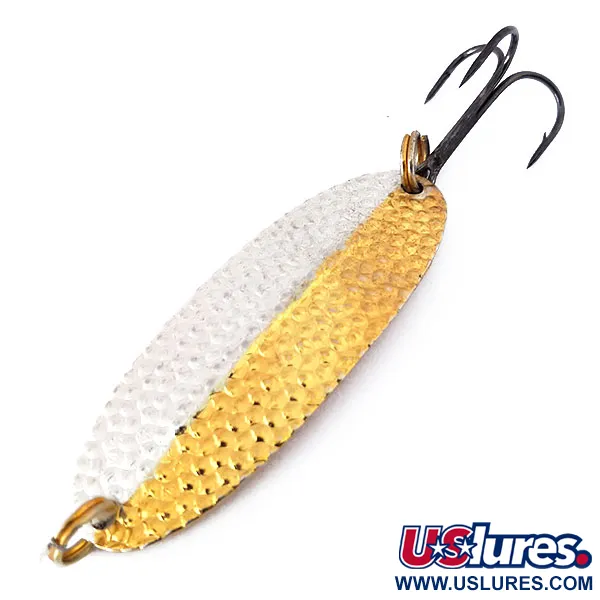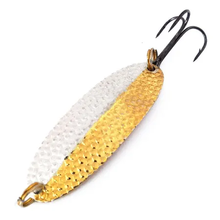 Výrazný tepaný povrch pokrývá dvoubarevné tělo této klasické plandavky v barevném provedení Hammered Gold and Silver. Tento konkrétní model Williams Wabler W50 s produktovým kódem 10494 váží 14 g (1/2 oz) a měří 6,7 cm (2 3/4"). Pravé stříbření na světlejší straně je charakteristickým znakem tohoto kanadského výrobce, což je tradice sahající až k počátkům firmy v roce 1914. Signaturní podélné žebro procházející středem je navrženo tak, aby zajišťovalo stabilitu při vedení nástrahy při vysokých i nízkých rychlostech. Tento exemplář s hodnocením 5/5 má velmi zachovalý vzhled s originálním osazením a ostrým černým trojháčkem. Plandavka Wabler, určená především k lovu štik a candátů, zůstává základním prvkem rybářských boxů od roku 1978, kdy se výroba plně přesunula do Kanady. Malé kroužky na obou koncích umožňují bezpečné upevnění a optimální umístění háčku.
