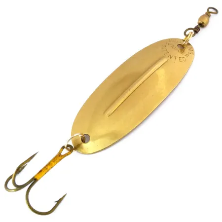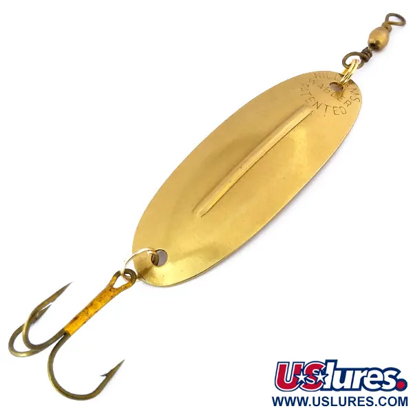 Tato mosazná plandavka Williams Wabler W50 o délce 6,7 cm (2 3/4") je vybavena ikonickým podélným žebrem, které definuje značku již od jejích počátků ve 20. letech 20. století. Tato kanadská klasika o hmotnosti 14 g (1/2 oz) nese jasně viditelnou ražbu „WILLIAMS WABLER PATENTED“ na konvexní straně. Zatímco mnoho nástrah Williams je známých svým stříbřením, tento exemplář se vyznačuje hřejivým mosazným povrchem, což je tradiční volba pro lov štik a candátů v různých světelných podmínkách. Stabilizační žebro je funkční konstrukční prvek určený k udržení konzistentního chodu při pomalém i rychlém vedení, což je technický prvek, který společnost zdokonalila po přesunu celé výroby do Kanady v roce 1978. Výbava zahrnuje robustní trojháček a mosazný válečkový obratlík, přičemž oba díly vykazují vysokou míru zachovalosti odpovídající hodnocení stavu 5/5. Produktový kód 10534 identifikuje tuto specifickou variantu velikosti W50, která zůstává základním kamenem pro sběratele severoamerických kovových nástrah. Povrch čistě odráží světlo a zvýrazňuje charakteristický oválný tvar, který zůstal po více než století v podstatě nezměněn.
