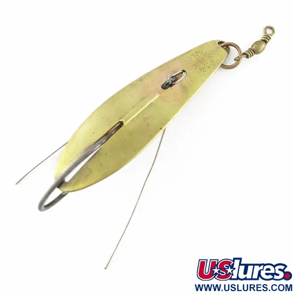 Přímo do mosazi vyražený původ „MADE IN CANADA“ potvrzuje, že Williams Weedler je klasickým řešením pro lov v husté vegetaci. Tato plandavka o hmotnosti 17 g (3/5 oz) využívá pevný jednoháček chráněný dvěma tenkými drátěnými ochranami, které pomáhají předcházet váznutí v hustém krytu. Čistá mosazná barva zůstává jasná po celém protáhlém těle, na kterém je výrazné vyražené logo a název produktu. Osazení zahrnuje robustní mosazný kroužek v přední části, ke kterému je pro připojení vlasce připojen válečkový obratlík ve vintage stylu. Se stavem hodnoceným 4/5 má kovový povrch čistý a poctivý vzhled bez výrazného opotřebení. Kód produktu 24080 identifikuje tuto konkrétní přívlačovou plandavku, která byla vyrobena s precizností typickou pro kovoobrábění kanadského výrobce.