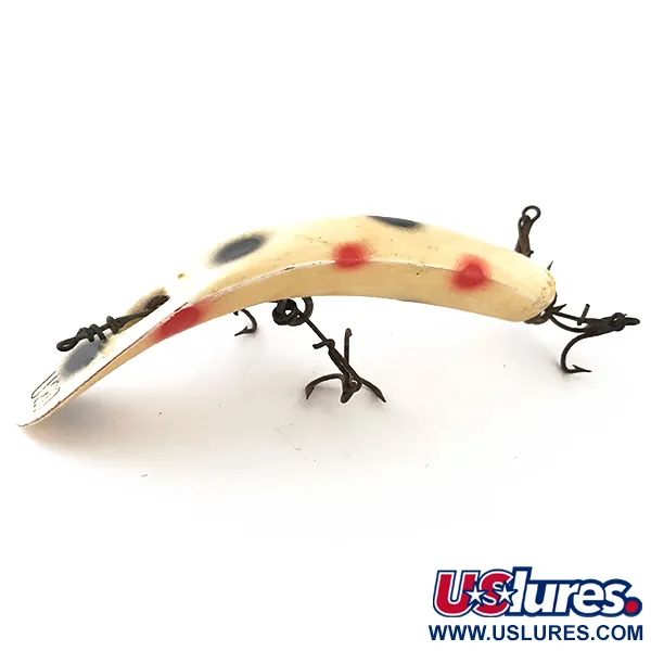 Krémový základ doplněný výraznými černými a červenými tečkami činí z tohoto exempláře atraktivní kousek pro každou sbírku. S délkou 9 cm (3 1/2") a hmotností 9 g (1/3 oz) nese charakteristické zakřivení typické pro řadu Yakima Bait Worden Flatfish. Nástraha s produktovým kódem 4791 je vybavena tradičním vahadlovým systémem pro více háčků, což je konstrukční detail určený pro pomalé vedení. Povrchová úprava zůstává jasná a čistá s hodnocením stavu 4/5, přičemž drátěné prvky vykazují vintage patinu, ale zůstávají pevné. Sběratelé ocení ručně malované rozmístění teček, které sleduje kontury těla až k zužujícímu se ocasu.