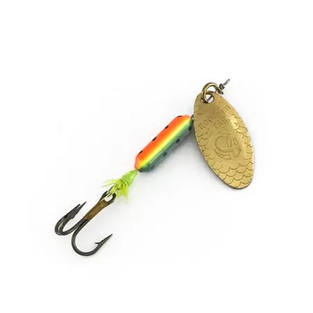 Zlatý list ve tvaru vrbového listu s raženou texturou šupin charakterizuje tuto rotační třpytku Yakima Bait o hmotnosti 1/8oz (3,6 g). Tělo o délce 5,5 cm (2 1/4") má barevné provedení Fire Tiger s oranžovým hřbetem, limetkově zeleným břichem a černými tečkami po stranách. List, na kterém je vyražena hmotnost a logo Rooster Tail, je upevněn na přímé drátěné ose, což je typické pro designy Howarda Wordena z poloviny minulého století. Ocas tvoří ručně vázané srpky v barvě chartreuse, které maskují ostrý bronzový trojháček. Tato nástraha, vedená pod kódem 7976, reprezentuje odkaz značky Yakima Bait v perfektním stavu. In-line konstrukce je vyvážena pro přesné nahazování v prochytávaných pstruhových vodách, kde je decentní profil rotačky často klíčem k úspěchu.