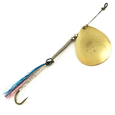 Na mosazném listu je jasně vyraženo označení „WORTH 4“, které identifikuje tuto klasickou americkou rotační třpytku. Společnost Worth, která je synonymem pro kvalitní rybářské komponenty, vyrobila tento model 6285 s listem ve tvaru slzy, který rotuje na robustním drátěném dříku. Nástraha měří 10 cm (4") a váží 3,5 g (1/8 oz). Tělo je tvořeno výraznou kovovou pružinou a dvojicí malých korálků. Mosazný povrch listu poskytuje jasný, reflexní povrch, který kontrastuje s ručně vázaným střapcem na koncovém jednoháčku. Tento střapec tvoří modrá, bílá a růžovo-červená lametka (tinsel) zajištěná černou nití. V současném stavu si nástraha udržuje hodnocení stavu 5/5, přičemž drát i háček zůstávají rovné a kovové části vykazují značný lesk.