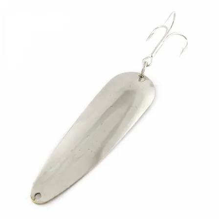 Leštěný niklový povrch 9 cm dlouhého těla této plandavky vyrobené v USA skvěle odráží světlo. S hmotností 21 g je tato Worth Chippewa klasickým příkladem odolné kovové nástrahy z dílny Worth Company ve Wisconsinu. Profil ve tvaru kapky má čistě ražené hrany a je osazen silným trojháčkem připevněným pomocí robustního kroužku v zadní části. V přední části se nachází přesně vyvrtaný otvor pro navázání vlasce nebo návazce. Tento exemplář s produktovým kódem 24315 je ve skvělém stavu s hodnocením 4/5 a jasným reflexním povrchem. Jednoduchý a účinný design plandavky Chippewa odráží přístup k přívlači a trolingu větších sladkovodních druhů ryb z poloviny minulého století, kdy byly klíčovými faktory viditelnost a hmotnost.