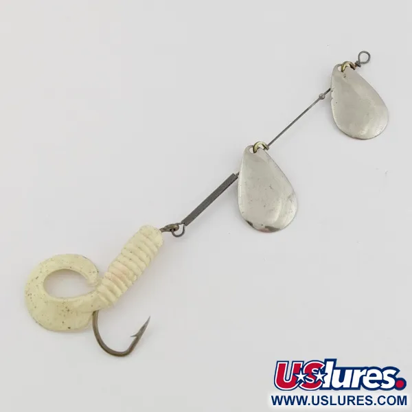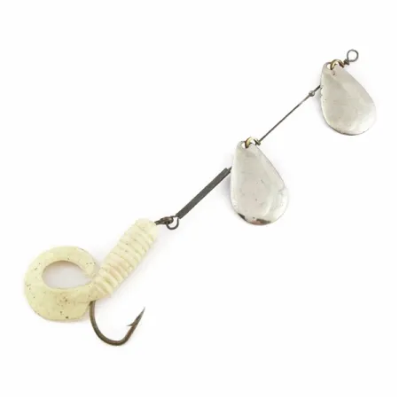 Dva poniklované rotační lístky ve tvaru kapky charakterizují horní část této sestavy a zajišťují stálé odlesky při plynulém přitahování. S celkovou délkou 13 cm (5") a hmotností 5 g (3/16 oz) je tato sestava vhodná pro lehkou přívlač nebo trolling ve sladkovodním prostředí. Niklová povrchová úprava lístků ladí s bílým twisterem, který obsahuje jemné stříbrné flitry pro zvýšení vizuální atraktivity. Červené korálky jsou umístěny na drátěné ose pro správný rozestup lístků a vytvářejí bod soustředění poblíž třmínků. Jednoháček je osazen žebrovaným měkkým plastovým ocasem, který je k rámu připevněn pomocí pevného drátěného očka. Výrobce Worth vyrobil tyto komponenty s jednoduchým očkem v hlavové části pro přímé navázání vlasce nebo použití malé karabinky. Celkový stav je hodnocen 5/5, vykazuje čisté kovové povrchy a pružný plastový přívěs. Tato specifická konfigurace, katalogizovaná pod produktovým kódem 24502, vyzdvihuje modulární povahu klasických konstrukcí rotačních třpytek.