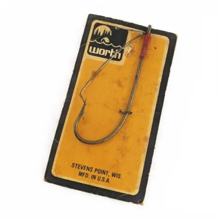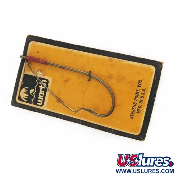 Poniklovaný povrch dodává tomuto neváznoucímu háčku, určenému pro lov v husté vegetaci, čistý a jasný vzhled. Jednoduchá drátěná ochrana je úhledně připevněna k očku ručně omotanou červenou nití, což zajišťuje, že hrot zůstane bez vázek. Společnost Worth vyrobila tento produkt pod kódem 24486 ve svém závodě v Stevens Point ve Wisconsinu. Háček je stále připevněn k dobové černo-žluté prodejní kartě a je v nepoužitém stavu s hodnocením 6. Grafika na obalu zobrazuje staré logo se stylizovanými prvky hor a vody, které jsou typické pro raný branding výrobce.