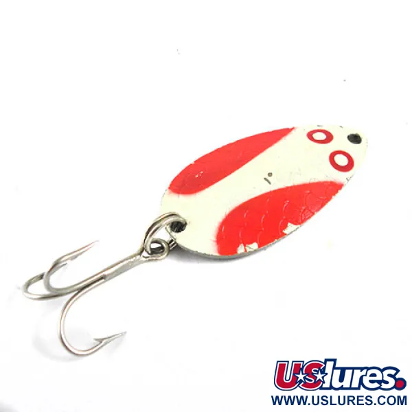 Tato plandavka o délce 1 1/2" (3,5 cm) se vyznačuje lakovanou přední stranou s výrazným červeno-bílým vzorem, doplněným detaily připomínajícími šupiny a červenýma kulatýma očima u hlavy. Wright & McGill Pay-Master, označený kódem 0941, je klasikou amerických rybářských kufříků poloviny století. Zadní strana nástrahy odhaluje leštěný niklový povrch, do kterého je hluboko vyražen název značky a hmotnost 1/4 oz (7 g). Ve stavu 4/5 zůstává lak sytý a osazení, včetně trojháčku a kroužku, je dobře zachovalé. Tělo nástrahy tvoří kovový polotovar ve tvaru kapky, který dodává potřebnou váhu pro nahazování. Každý detail, od jasného značení na rubu až po specifický nános barvy, odráží výrobní standardy kdysi běžné v USA. Očko v hlavové části je čistě vyvrtané a určené pro standardní kroužky nebo karabinky.