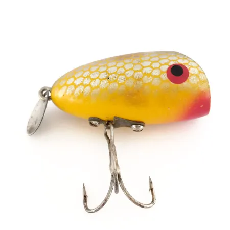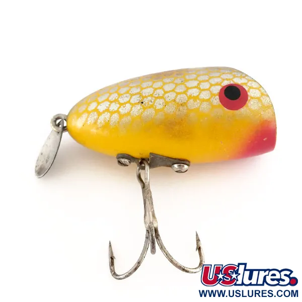 S délkou 4,5 cm (1 3/4") je kompaktní profil této hladinové nástrahy ideální pro lehkou přívlač. Tento model o hmotnosti 10 g (1/3 oz), známý jako Wright & McGill Rustler, nese produktový kód 9813 a je určen pro lov na hladině nebo velmi mělké vedení. Tělo má zářivě žlutý povrch s voštinovým vzorem šupin, který přechází ve výraznou černou konkávní přední část. Červená barva pokrývá spodní část pod hlavou a obklopuje velké černé zornice. Na ocase je připevněn malý kovový lístek pro vytvoření odlesků, zatímco břišní kování je upevněno pomocí speciální kovové destičky s jedním trojháčkem. Tento kus je hodnocen stavem 5/5 a zachovává klasickou estetiku historického řemesla z USA.