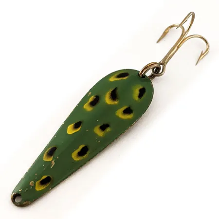 Mosazná konstrukce tvoří základ této 4,5cm (1 3/4") plandavky ve tvaru kapky. Přímo do zadní kovové strany jsou vyraženy nápisy Wright & McGill a Streamliner, které jsou ostré a čitelné a identifikují tento konkrétní exemplář produktovým kódem 11704. Přední strana je vyvedena v tradičním vzoru Frog, který se vyznačuje tmavě olivově zeleným základem zdobeným černými skvrnami se žlutým lemováním, které imitují přirozenou kořist. Při hmotnosti 7 g (1/4 oz) je nástraha osazena trojháčkem ve zlatém odstínu, který je zajištěn spojovacím kroužkem na širším konci těla. Tento v USA vyrobený rybářský kousek vykazuje stav 5/5, přičemž emailový lak si zachovává svůj původní lesk a mosazná zadní strana má čistý a jasný vzhled. Zúžení kovu směrem k očku pro navázání vlasce naznačuje design určený pro nahazování nebo trolling v různých sladkovodních podmínkách.