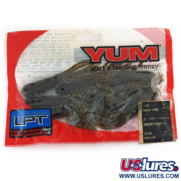 Tyto 3" (7,5 cm) měkké nástrahy v provedení Green Pumpkin jsou silně napuštěny krystaly soli a mají strukturovaný povrch navržený pro tažení po kamenitém dně nebo hustou vegetací. Tyto kusy využívají technologii Live Prey Technology (LPT) od YUM, což je atraktant na bázi enzymů, který má simulovat vůni a chuť přirozené potravy. Tělo se vyznačuje tlustostěnným dutým provedením, které přechází v jemné třásně chapadel. Toto balení, označené kódem produktu 9734, zůstává v nepoužitém stavu, přičemž měkký plast si zachovává svou tovární pružnost a výrazné černé flitry. Jako exempláře ve stavu 6 nevykazují nástrahy žádné známky nastražení nebo degradace vlivem okolního prostředí a udržují si svůj původní olejový lesk. Hustý obsah soli dodává 3" (7,5 cm) profilu funkční váhu, což napomáhá kontaktu s dnem při lovu na tube jig nebo Texas rig.
