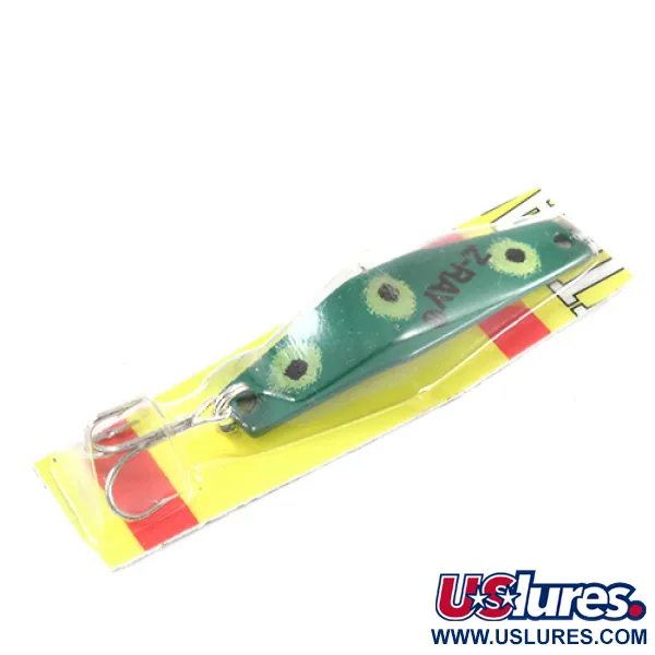 Tmavě zelené zbarvení tvoří základ modelu Z-Ray Model 120, který se vyznačuje výraznými žlutozelenými halo efekty a černými středy tvořícími vzor Žába. Tato plandavka o hmotnosti 1/4 oz (7 g) je vyrobena v USA společností Z-RAY Lures a měří 2" (5 cm) na délku. Nástraha s produktovým kódem 2561 je nepoužitá a zůstává v původním průhledném blistru. Kovové tělo nese ostré ražení Z-RAY a je osazeno standardním trojháčkem. Zadní karta je dobře zachovalá a zobrazuje klasickou červeno-žlutou grafiku spolu s čárovým kódem a podrobnostmi o produktu.