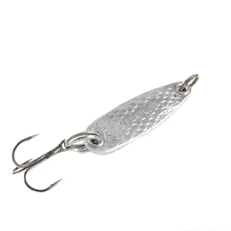 Tento Zip Flatlure o hmotnosti 44 g s výrazným vzorem šupin vyraženým na kovovém těle slouží jako robustní americký vertikální jig. S délkou 6 cm má nástraha leštěný stříbrný povrch, který zvýrazňuje texturovaný povrch. Reliéfní nápisy „FLATLURE“ a „TRADE MARK“ zůstávají na boku kovu ostré a identifikují tento konkrétní model vyrobený v USA pod produktovým kódem 1694. Tento konkrétní kus je ve stavu 5/5, vykazuje jasný povrch a zachovalé komponenty včetně originálních kroužků. Na ocase je připevněn jeden trojhák, určený pro hlubinný vertikální jigging nebo techniky dalekého nahazování.